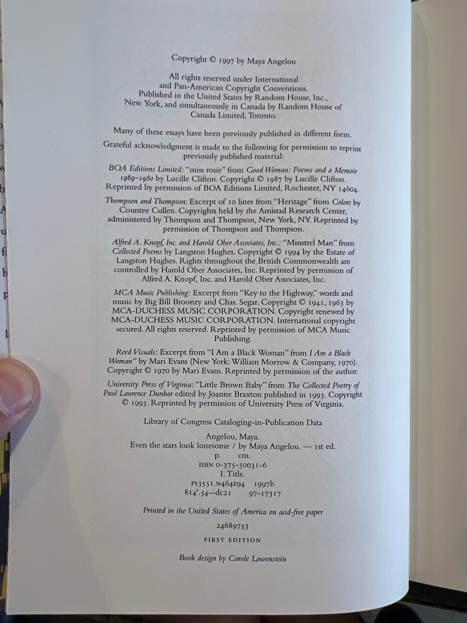 Title: Even the Stars look Lonesome Author: Maya Angelou Copyright: 1997 Publisher: Random House Edition: First Edition, second printing