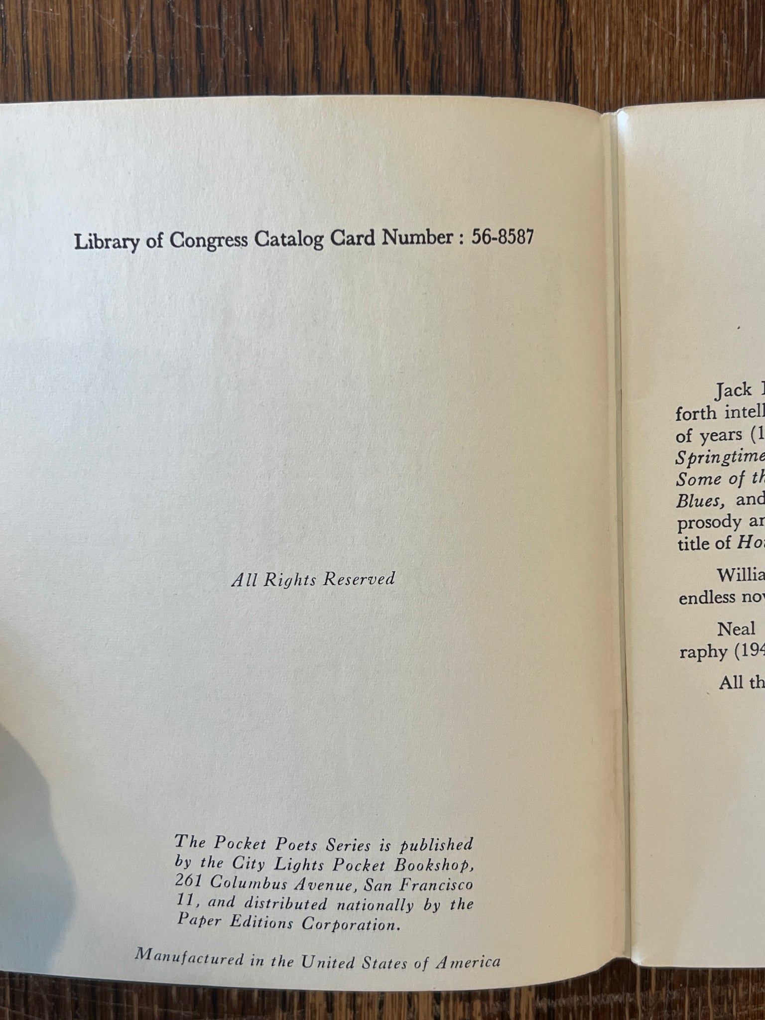 San Francisco: The City Lights Pocket Bookshop. 1957, Third printing. 44 pages. Bound with staples on spine. In good condition, with slight staining on outside cover as well as one annotation on page 24.