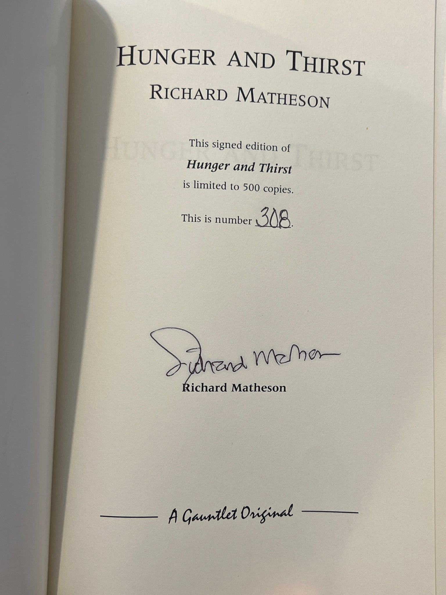 A Gauntlet Publishing, Signed and numbered edition of Hunger and Thirst of which this is 308/500. Printed in 2000, this First Edition is a limited find for any fan of Richard Matheson