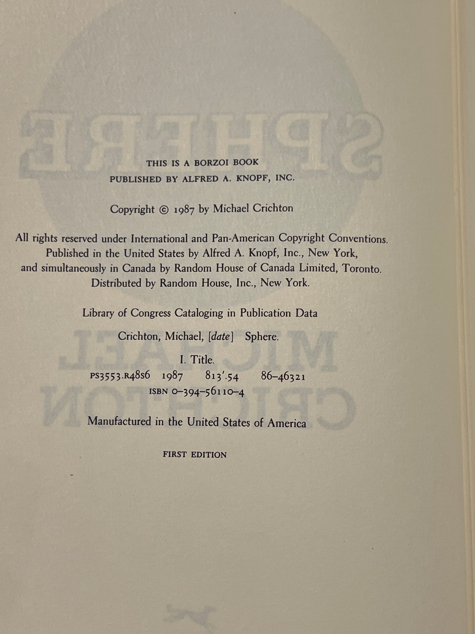 Title: Sphere Author: Michael Crichton Copyright: 1987 Publisher: KNOPF