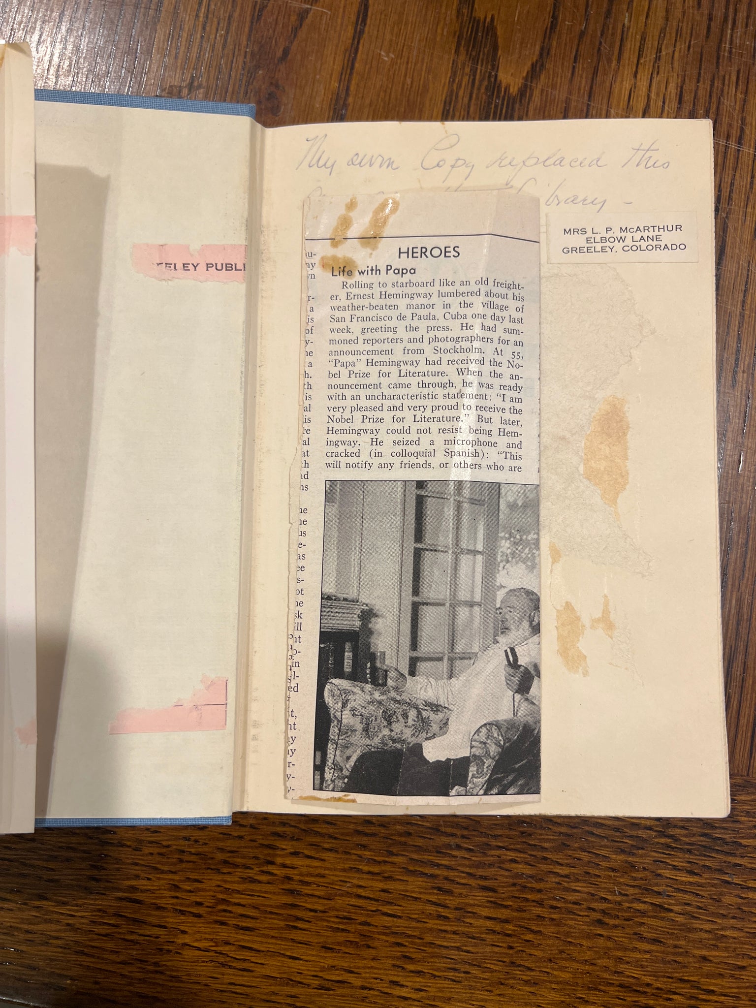 Condition: Good, Ex- Library, dust jacket wrapped in protective mylar cover. Has library stamps on outer pages as well as damage on first inner pages. Also has a newspaper clipping about Hemingway