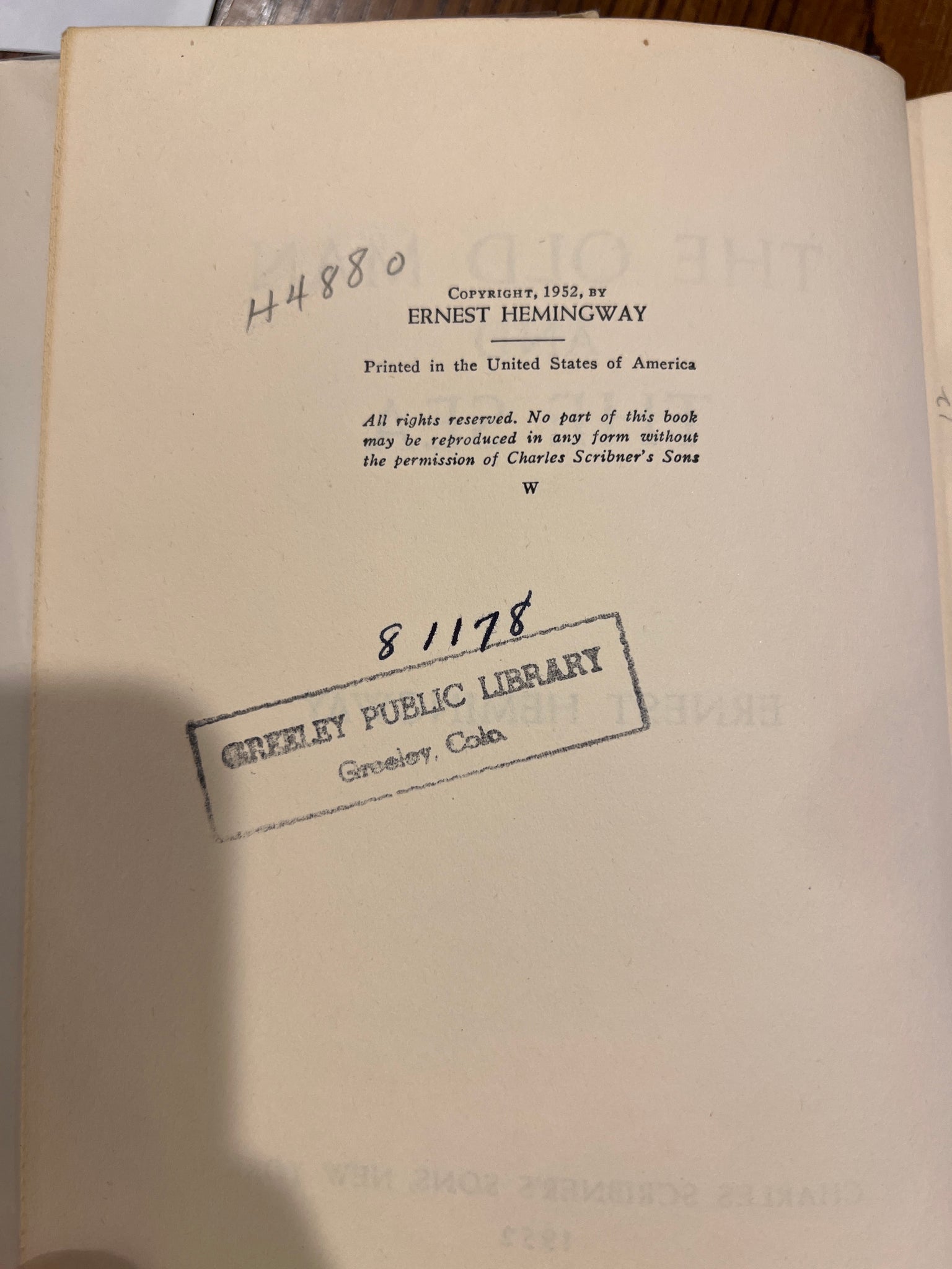 Title: The Old Man and the Sea Author: Ernest Hemingway Copyright: 1952 (W) Publisher: Charles Scribner's Sons, New York