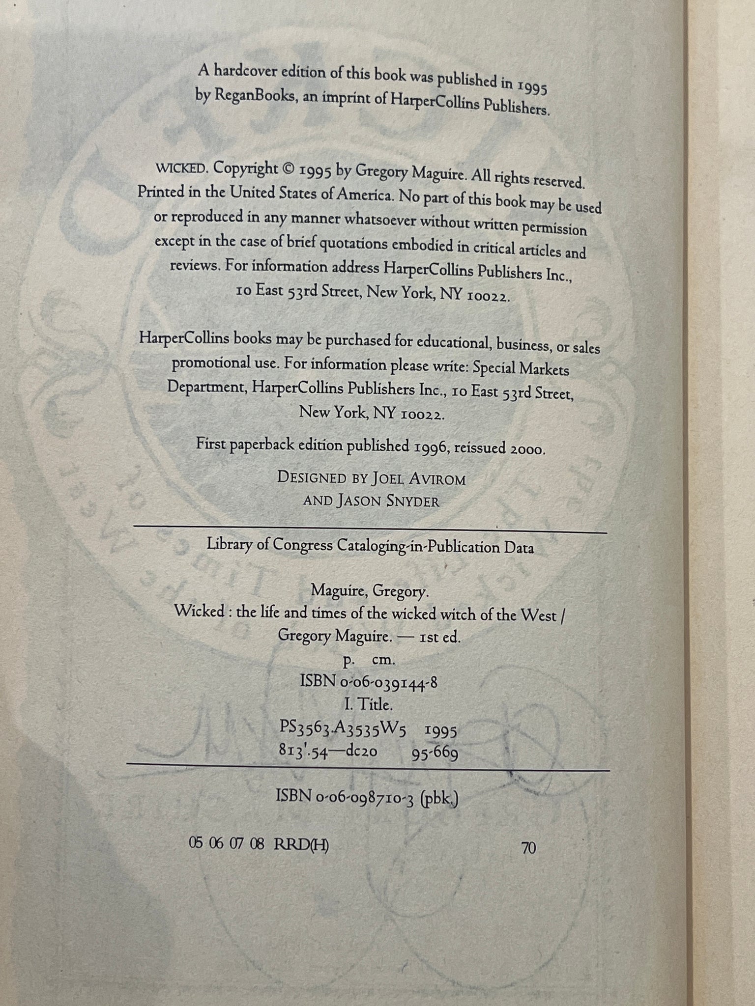 Title: Wicked Author: Gregory Maguire Copyright: 2000 Publisher: Regan Books